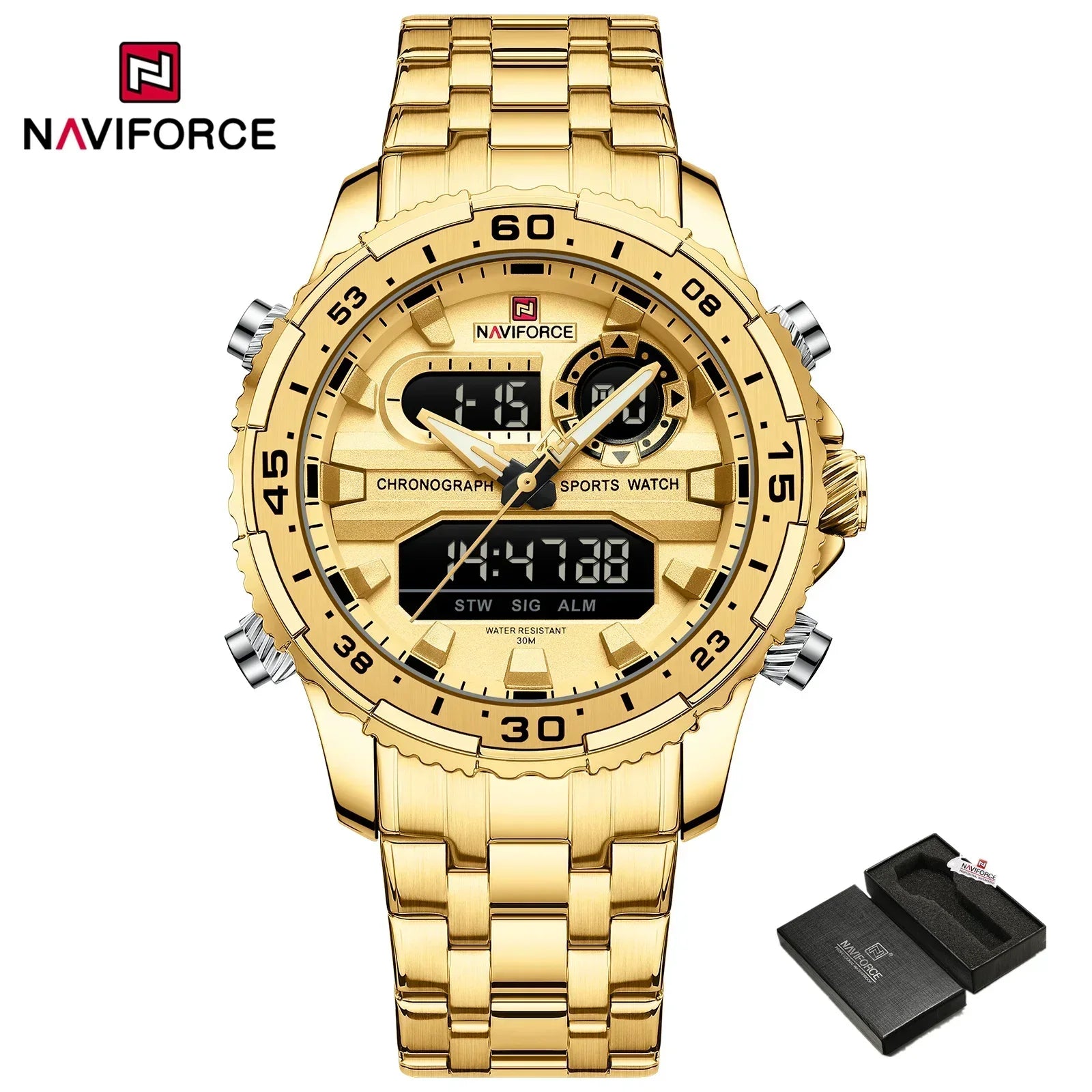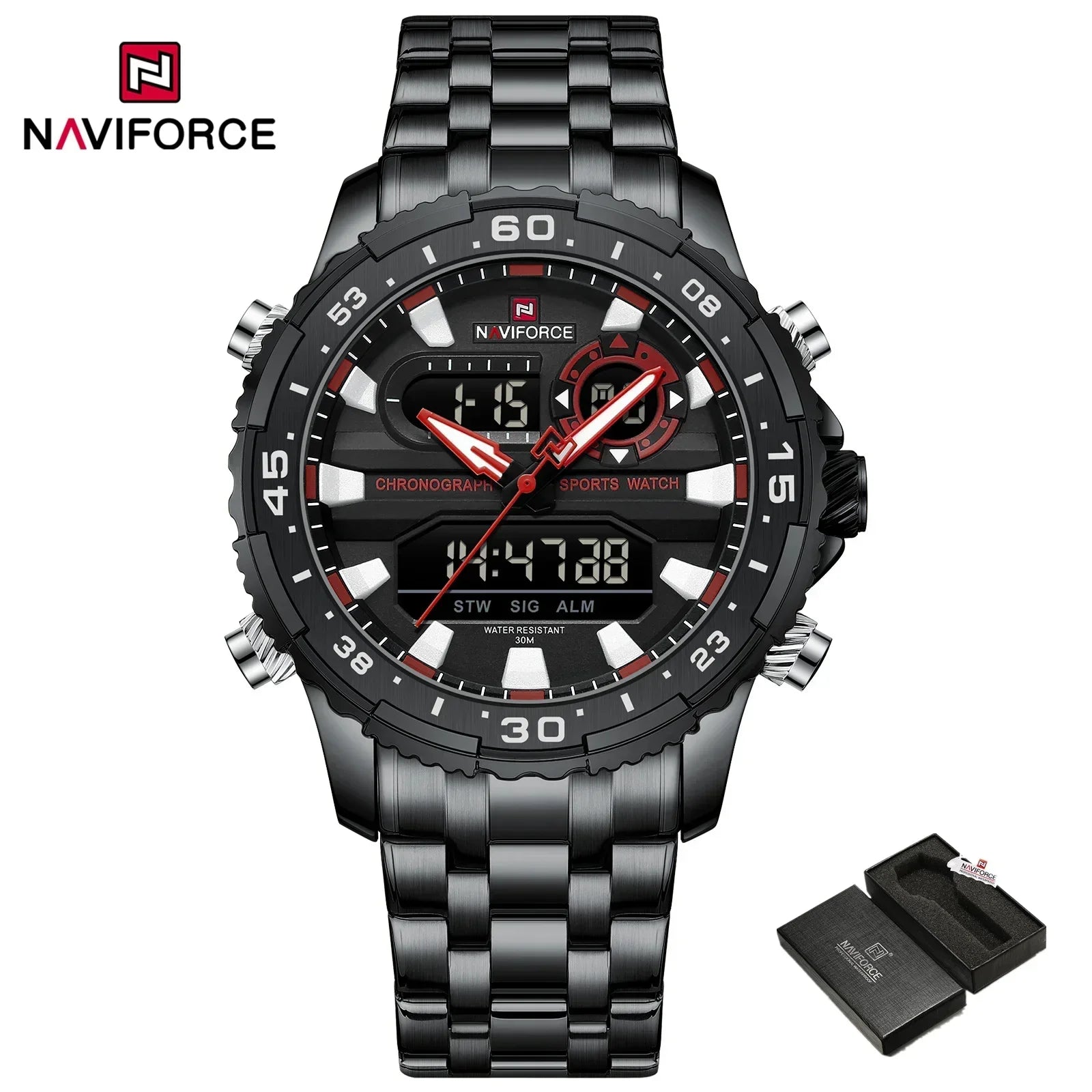ساعة NAVIFORCE NF9234 الأصلية التناظرية الرقمية الرياضية كوارتز للرجال، ساعة منبه من الفولاذ المقاوم للصدأ مضيئة ومضادة للماء